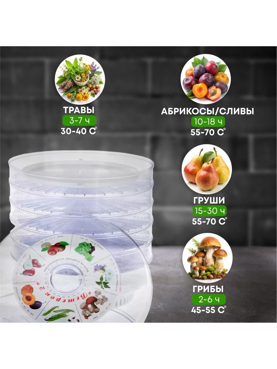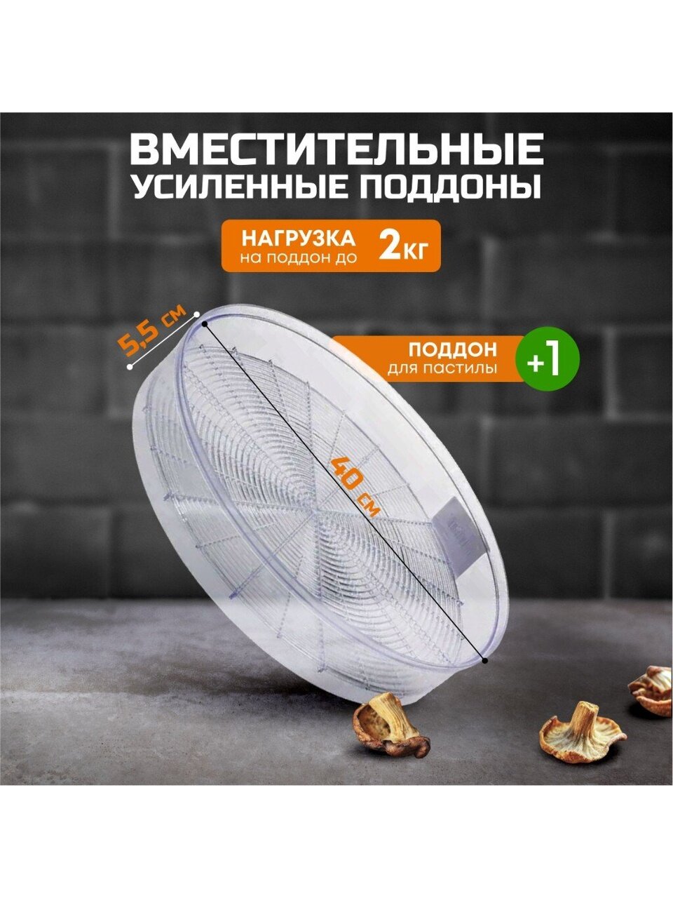 В модели Ветерок-2 Вы сможете заготовить на зиму сушеные овощи, фрукты и грибы. Каждый поддон дает возможность компактно разместить на нем до 2 кг продуктов. Сушилка комплектуется одним поддоном для пастилы.
