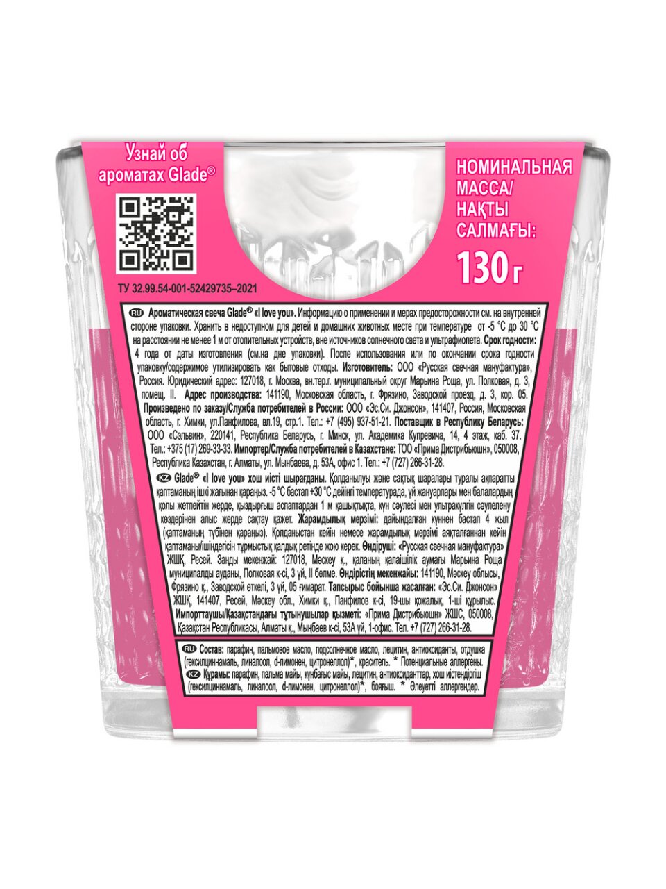 Свеча Glade I love you 130 г — идеальный подарок для создания романтической атмосферы: 30 часов цветочного аромата, стильный дизайн, выгодная цена.