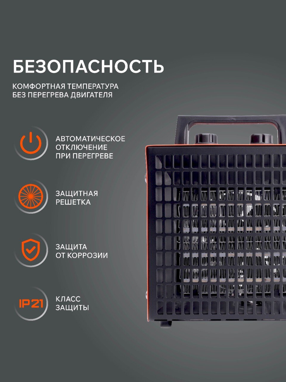 Данная модель рассчитана на эффективный обогрев помещений объёмом до 153 м³, что отлично подходит для комнат, небольших мастерских и бытовых построек.