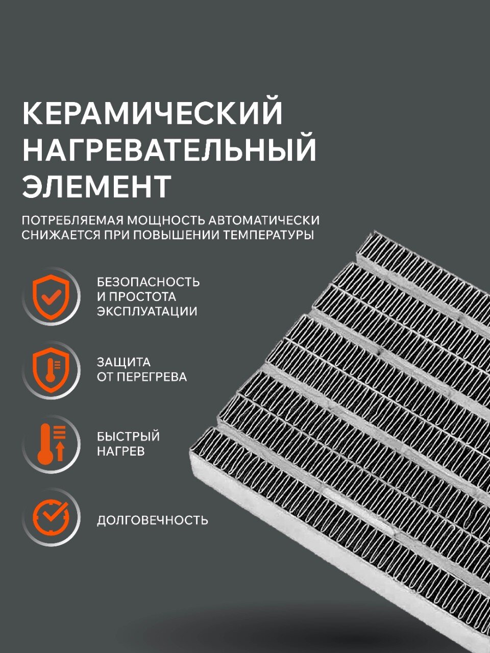 Керамический элемент обеспечивает быстрый нагрев, равномерное распределение тепла и долговечность работы, не сжигает кислород и не сушит воздух, что особенно важно для жилых помещений.