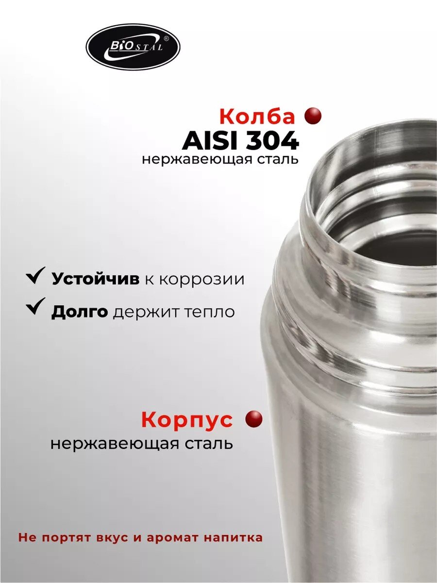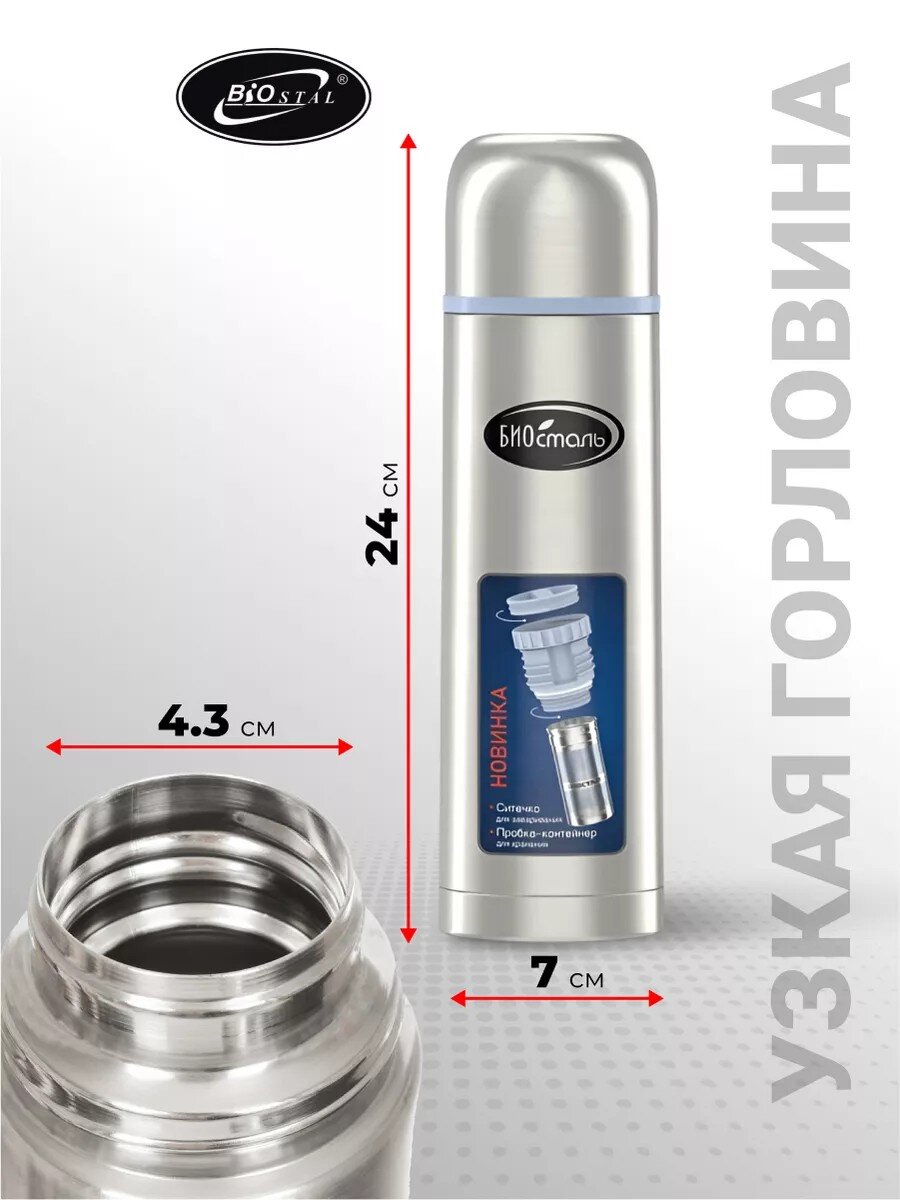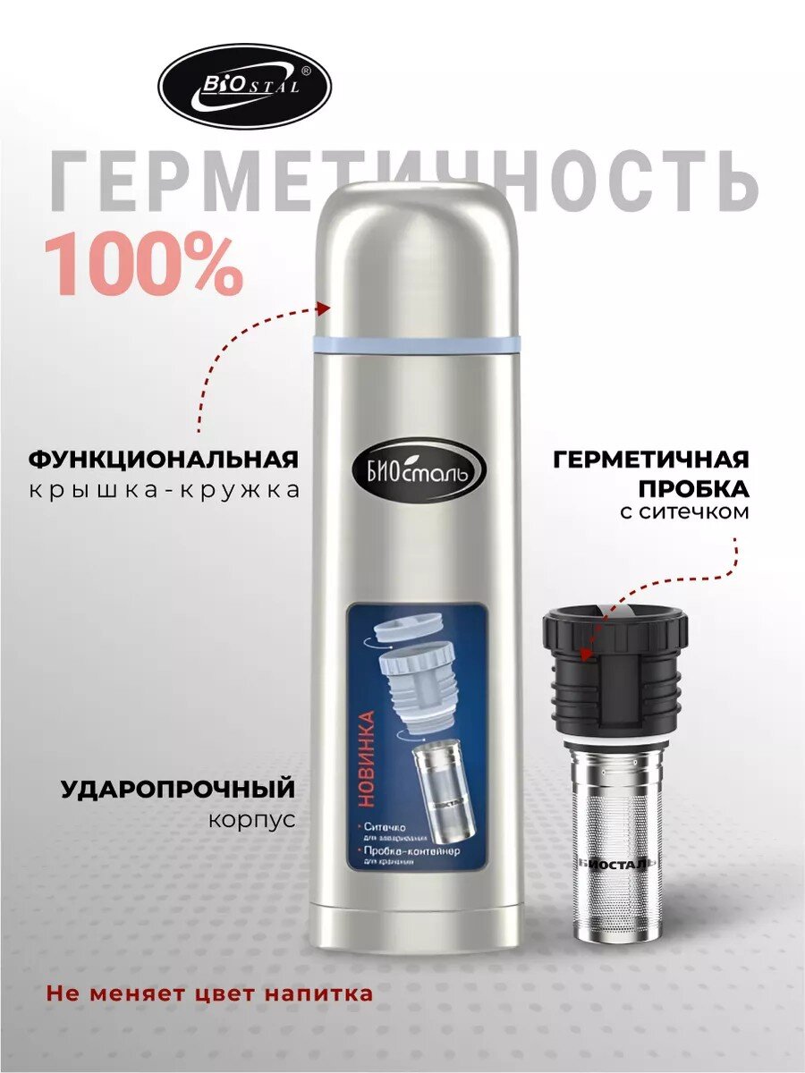 Термос Biostal 0.5 л из нержавеющей стали с ситечком — держит тепло до 24 часов, компактен, идеален для города, путешествий и подарка.