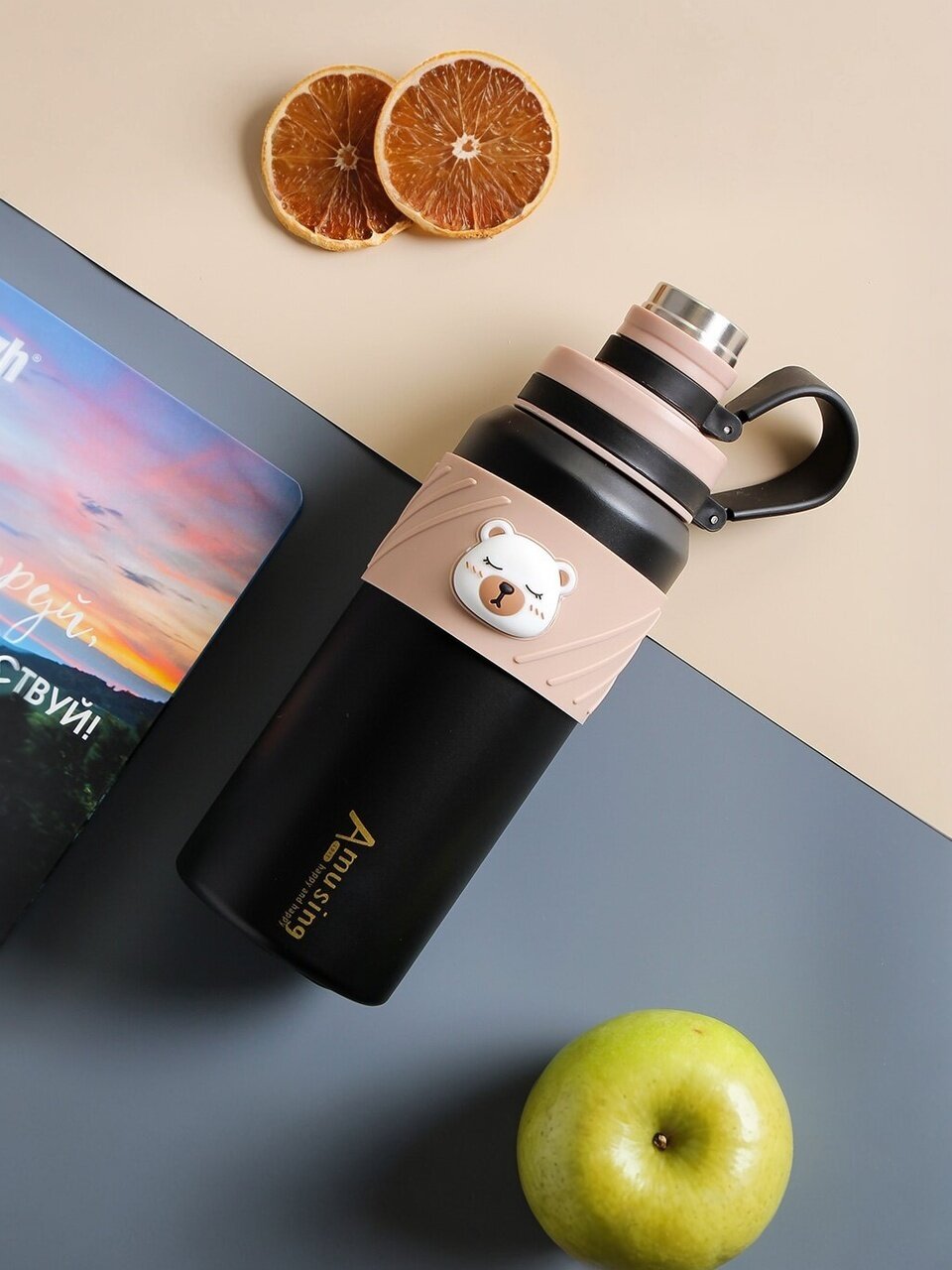 Термобутылка из нержавеющей стали 0.6 л с трубочкой: удобно брать в спортзал, авто или поход, напитки остаются горячими и холодными до 8 часов.
