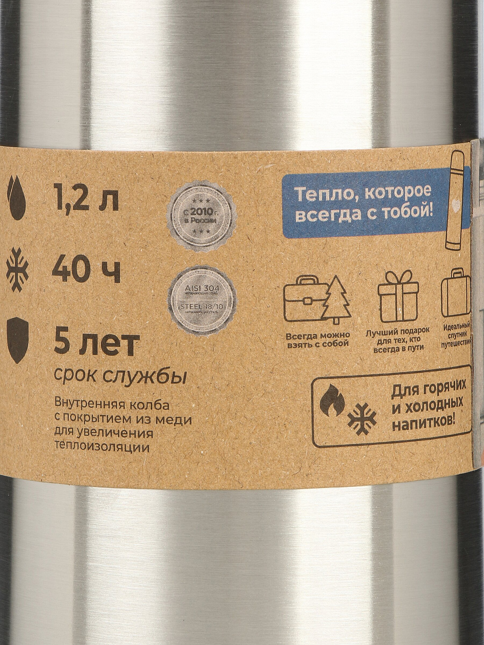 - Практичный объём 1,2 литра, корпус и колба из серебристой стали, устойчивость к ударам и деформациям — оптимален для активного отдыха.