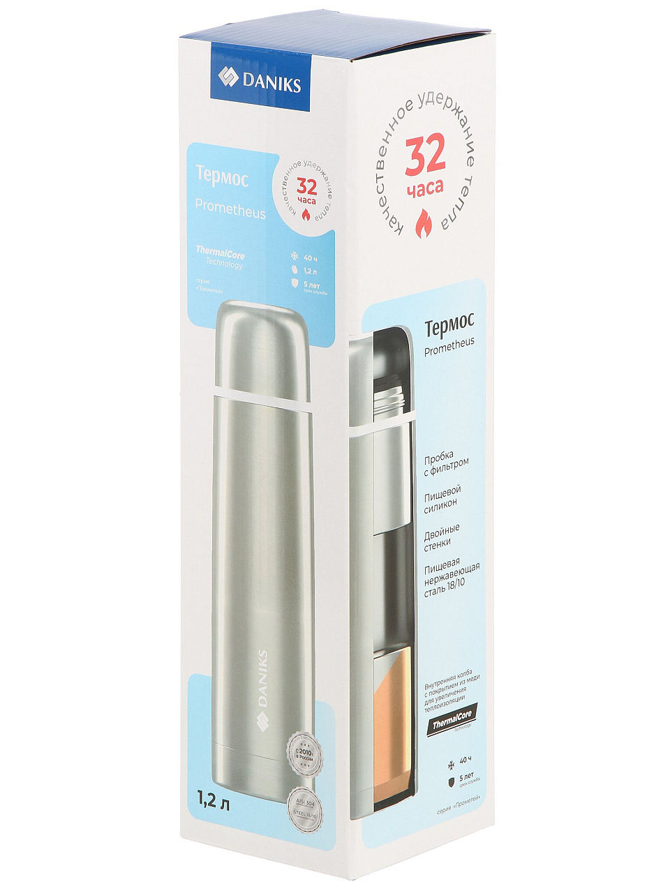 Термос Daniks Прометей 1,2 л: сохраняет напитки горячими до 32 часов, ударопрочный корпус из нержавеющей стали, идеален для спорта и походов.