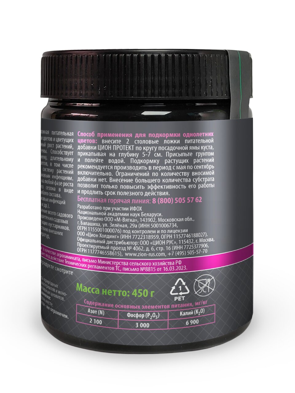 Удобрение для цветов Protect Zion 450 г — быстрый рост, здоровые корни и защита от болезней для ваших комнатных и садовых растений круглый год.