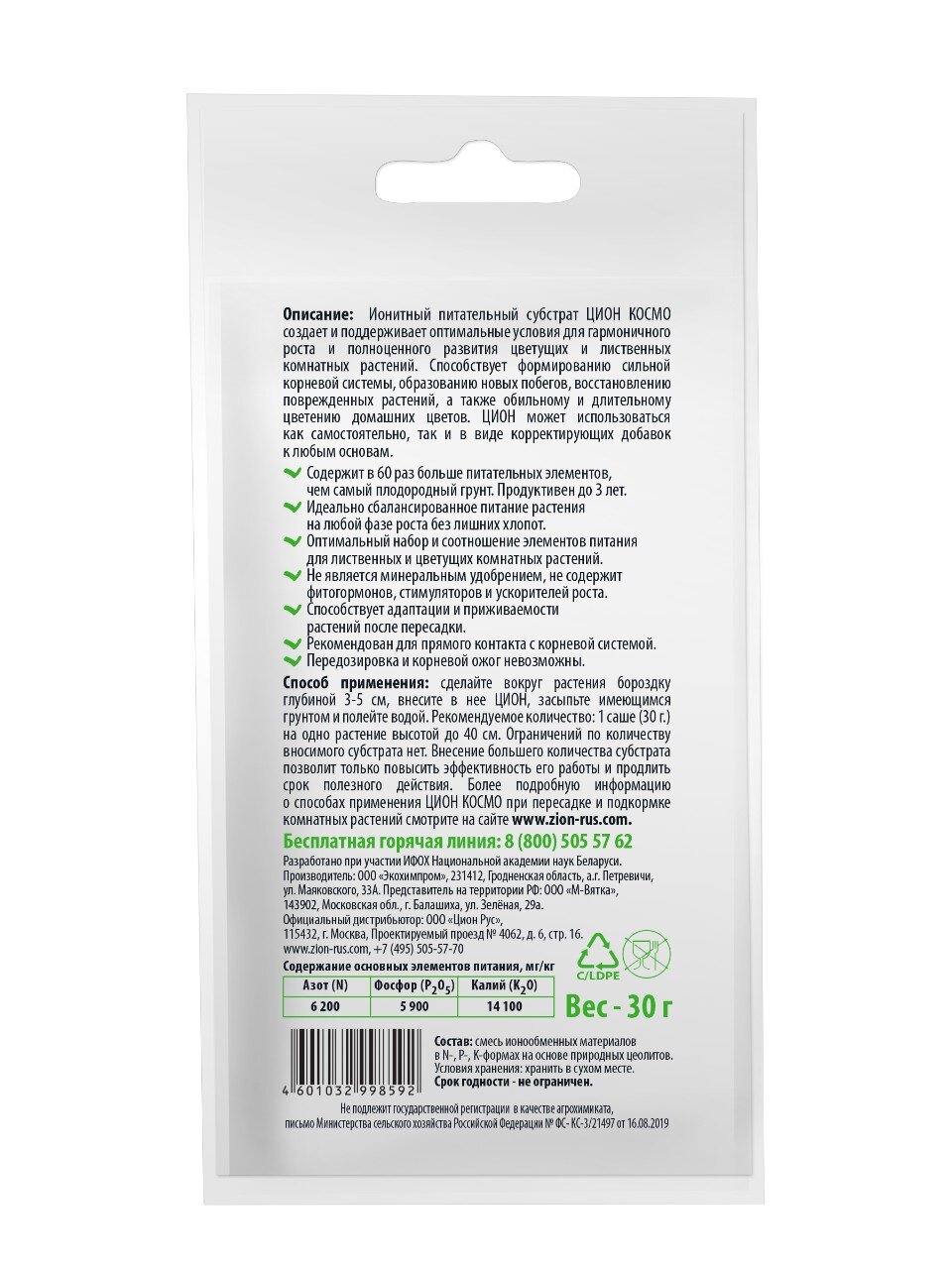 ЦИОН Космо содержит в качестве носителя небольшой процент органической полимерной матрицы, в отличие от остальных продуктов ЦИОН, где в качестве носителя элементов питания растений используются природные минералы (цеолиты). Органический полимерный носитель позволяет дозировать и доносить до корней растений азот в нитратной форме. Таким образом, декоративно лиственные комнатные растения гармонично развиваются в помещении, увеличивая размер и количество листьев и приобретая яркий, насыщенный цвет.