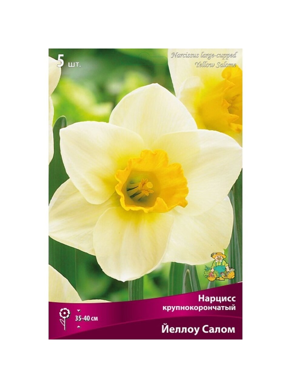 Нарцисс крупнокорончатый Йеллоу Салом даёт крупные цветы с белыми лепестками и ярко-жёлтой коронкой. Луковицы поступают из Нидерландов, подходят для оптовых и розничных покупок.
